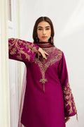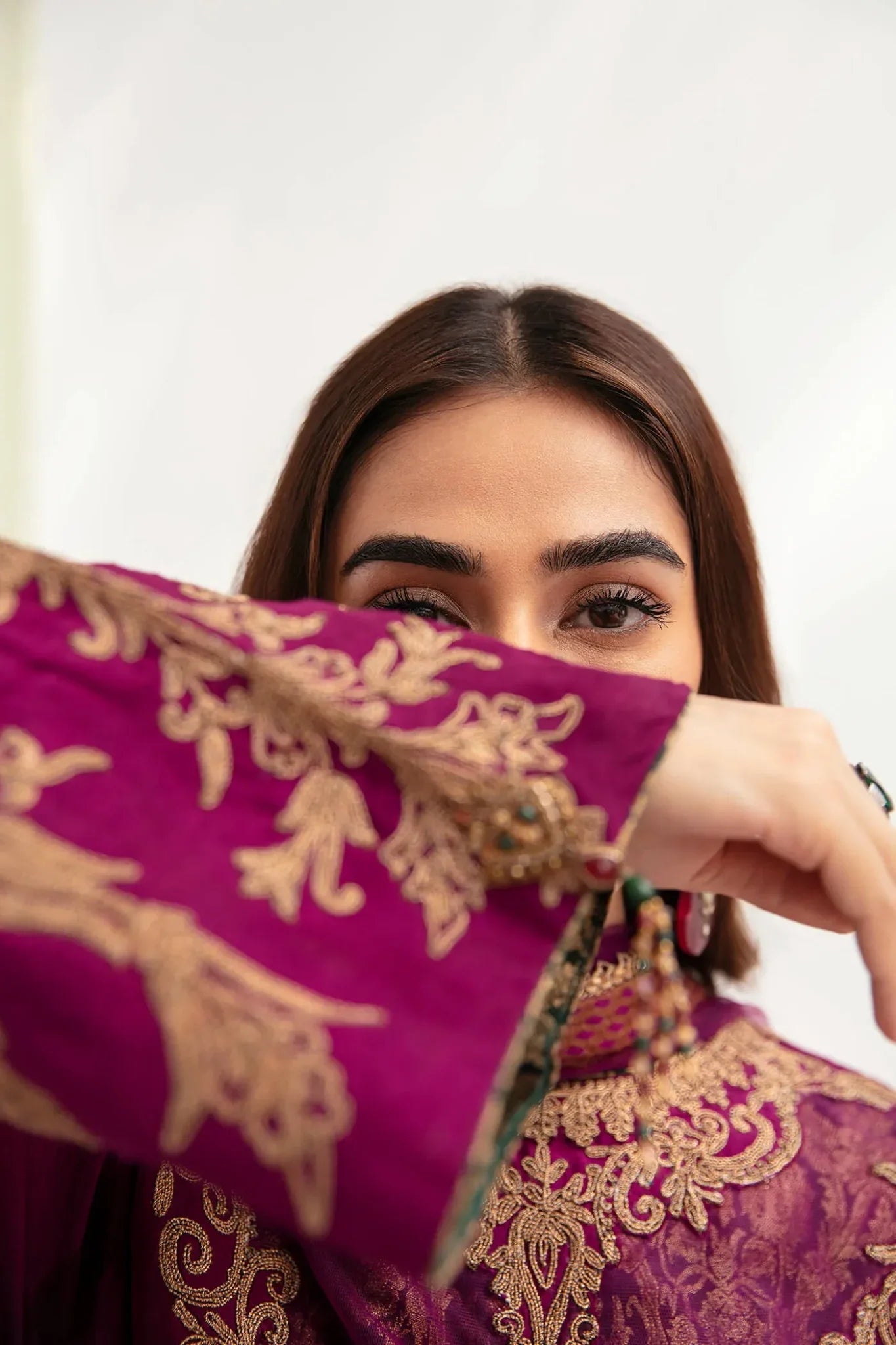 ‘Presenting ‘Mauve Passion’, a masterfully crafted ensemble that captures the essence of luxury and grace. A richly detailed neckline, adorned with meticulous maroori work, gleaming jewel pieces, and cascading tassels, sculpting a silhouette that is both flattering and timeless. The ensemble resonates with grandeur and sophistication, seamlessly paired with bell-bottom pants. Completing the look is a delicate net dupatta, framed with shimmering kimkhaab borders. ‘Mauve Passion’ is more than fashion—it’s an ode to refined chic elegance.