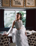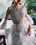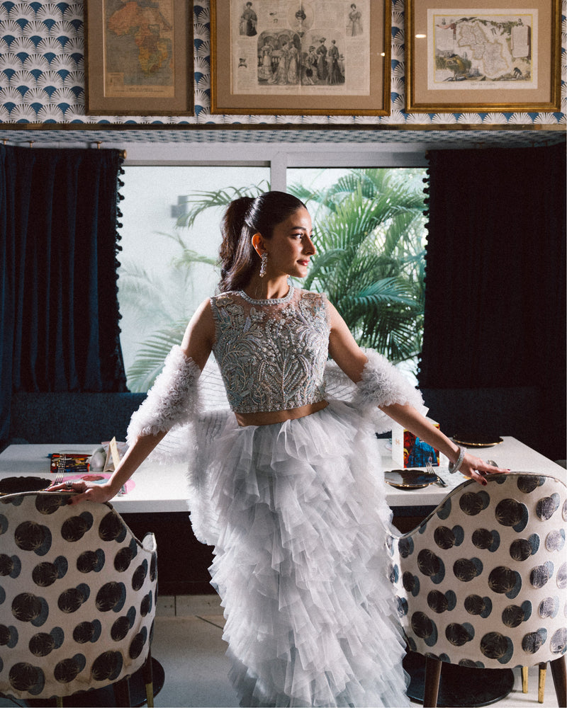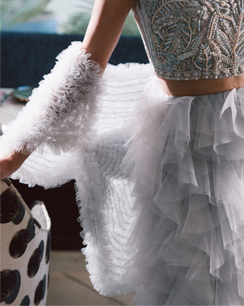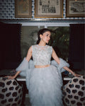 The amber-hued net tulle ruffled skirt of this stunning costume exudes elegance and movement with each stride. The skirt is a statement of effortless elegance, perfect for creating a dramatic yet refined look. A gorgeous embroidered shirt with delicately worked sleeves completes the ensemble and adds a touch of artisanal detail to the skirt. The combination of textures and colors make this design ideal for Eid celebrations and festive soirées, oozing charm and refinement.
