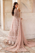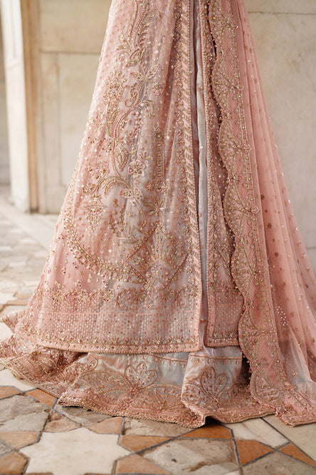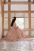 Vaoshy presents an exquisitely crafted ensemble that embodies timeless elegance and refined artistry. The gown features a delicately designed neckline enhanced with intricate appliqué and a blend of embroidery, sequins, and adda work that lends a regal charm. The back is beautifully composed with refined detailing, creating a graceful balance of structure and embellishment. Flowing sleeves add a sophisticated touch, complemented by fine borders and ornate center motifs that highlight the craftsmanship. The gown, designed in a front-open style, carries a harmonious blend of embroidery and sequins along with statement borders and central patterns that elevate its allure. Paired with a lehnga featuring multiple panels adorned with rich embroidery, sequins, and elaborate borders, this creation celebrates tradition with a contemporary finesse. A masterpiece of artistry, it is designed for those who appreciate luxury and heritage in every detail.