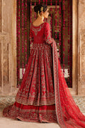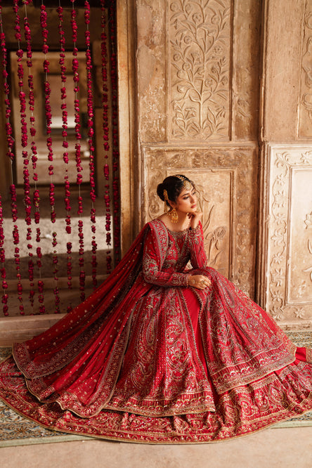 This exquisite ensemble is a true statement of elegance, crafted with meticulous detailing and timeless artistry. The peshwas features a length of fifty inches with a generous ninety-inch flare, enhanced by delicately embroidered and sequined adda work. The bodice is designed with refined proportions, flowing into eight panels, each finished with intricate borders that elevate its grandeur. A beautifully deep neckline with balanced width complements the silhouette, while the full-length sleeves carry central motifs and fine embellishments. The lehnga, with its graceful length and dramatic flare, is adorned with heavily worked borders that reflect masterful craftsmanship. Completing the look, the net dupatta showcases a four-sided border and subtle center spray, adding a touch of ethereal charm. Every element of this attire speaks of luxury, artistry, and sophistication, making it a perfect choice for special occasions.