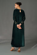 This elegant ensemble is crafted from premium velvet, designed to combine luxury with timeless sophistication. The neckline is beautifully enhanced with ada work and delicate ada spray, featuring a near-to-neck design with a subtle back keyhole detail. The fitted sleeves, styled with a mid-seam and adorned with intricate ada work, add a refined touch. The shirt length is perfectly tailored, finished with exquisite hangings and a short slit for ease of movement. Paired with a straight trouser, this outfit reflects understated glamour and classic charm, making it a graceful choice for any formal occasion.