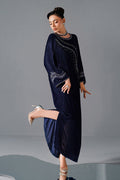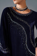 This elegant ensemble is crafted from luxurious velvet, featuring a refined boat neckline with intricate adda work that enhances its sophistication. The shirt is beautifully adorned with a combination of machine embroidery, sequins, and delicate adda work spread across the fabric, adding a subtle shimmer and timeless charm. Designed with loose sleeves and a graceful short slit, the outfit balances modern style with traditional artistry. The straight trouser is tailored from premium raw silk, completing the look with a sleek and polished finish. A perfect choice for those who appreciate exquisite craftsmanship and classic elegance..
