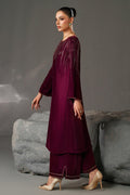 This exquisite ensemble is crafted from luxurious Velvet, designed with a graceful boat neckline beautifully adorned with intricate machine embroidery, fish sequins, and delicate adda work. The sleeves carry the same artistry, featuring fine embellishments and a refined round hem that enhances the overall elegance. The shirt, tailored in a flattering length, flows effortlessly with a richly embroidered hemline, adding depth and sophistication. Paired with a chic short-slit culotte, detailed with adda work on premium velvet, this outfit is the perfect balance of traditional craftsmanship and contemporary style.