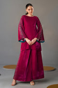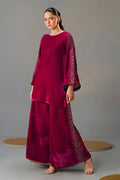 This elegant ensemble is crafted in luxurious velvet, beautifully adorned with meticulous machine embroidery, sequin, and adda work. The shirt features a stylized boat neckline with a contrast shamooz tapping detail, adding a refined edge to the design. Its graceful bell sleeves, center slit, and embellished hem enhance the overall sophistication. Paired with flared culottes highlighted with delicate embroidery and sequin work, the outfit creates a perfect balance of tradition and modern elegance. A timeless statement piece designed to make you stand out with effortless charm.