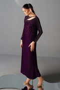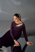This elegant ensemble is crafted from premium china velvet, featuring a stylized neckline beautifully adorned with intricate adda work. The shirt is designed with pure hand adda embellishments on the neckline, sleeves, and overall surface, offering a luxurious touch. A mid-seam detail enhances the silhouette, complemented by a straight hemline with a subtle side slit for graceful movement. Paired with straight trousers made from high-quality PK raw silk, the outfit perfectly balances tradition and modern refinement. The timeless craftsmanship and rich fabric make it an ideal choice for sophisticated occasions.