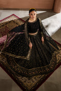 A regal black velvet lehenga set with intricate embroidery and adda work. The bodice features a broad neckline with detailed borders and delicate sequin accents. The lehenga is designed with multiple panels, rich borders, and side tassels for added elegance. The dupatta is scalloped and finished with an all-over spray, completing the look with a soft, graceful touch. Perfect for formal and bridal occasions.