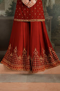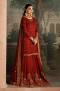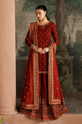 A classic rust velvet 3-piece ensemble designed with understated elegance. The shirt features a graceful neckline, delicate borders, and an all-over sequin spray for a soft shimmer. The sharara is crafted with multiple panels, creating a beautiful flare with embroidered borders. The dupatta is finished with a three-sided border and fine detailing, adding a touch of refinement. Perfect for formal and festive occasions.