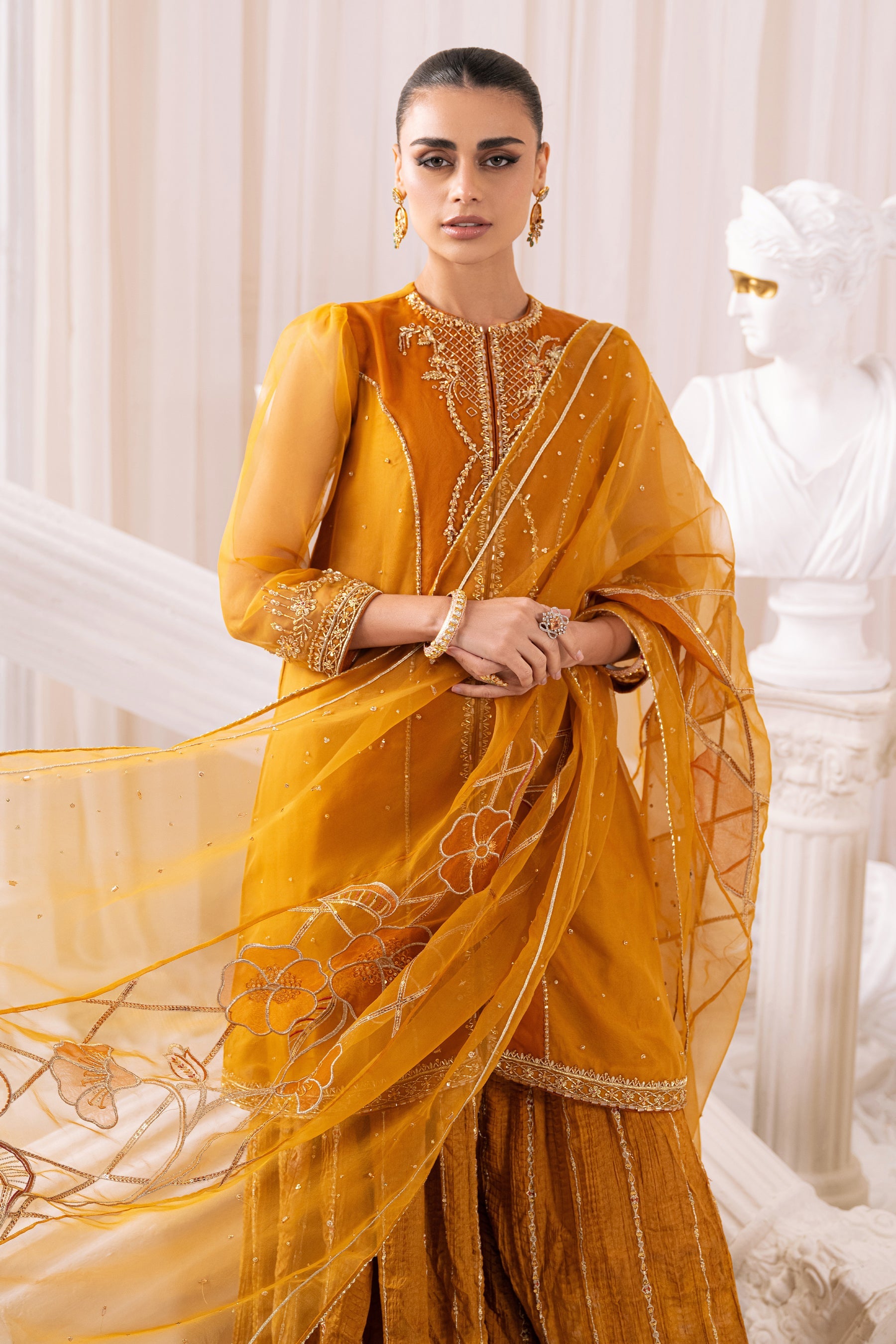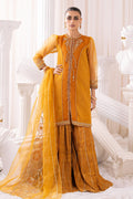 This mustard art piece comprises of pure embellished near to neck neckline along with a monochromatic princess panel on the front adorned with embellishments enhanced with light adda spread all over the shirt front finished with border. Sleeves are jeweled with adda work, finished with border. Outfit is topped with organza dupatta highlighted with middle applique adorned with floral motifs & sequins jaal finished with sequins spread , lace & goti. Outfit is paired with embroidered line patterned crushed sharara.