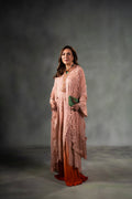 A light coral heavily embroided kaftan with an emballished neckline and floral borders paired with crushed chiffon shadded tangerine and coral pants.The beautiful net dupatta completes the ethereal look..