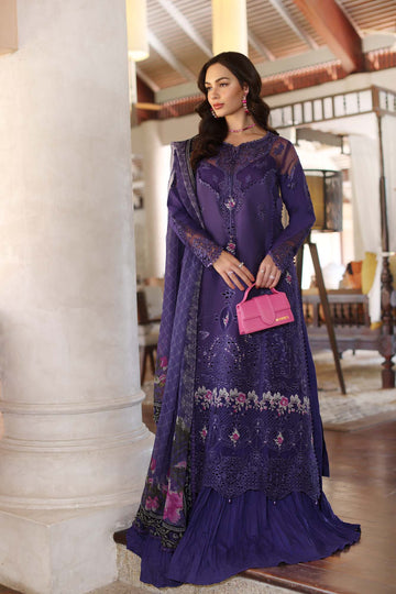 Get ready to shine this Eid in our breathtaking luxury handwork lawn outfit. The outfit features schiffli embroidered sequins lawn with laser applique patches on cyber grape color. The stunning floral cross stitch border in rose pink colors with lace like hem border, adding a touch of elegance. Paired with beautiful cross stitch pattern digital printed chiffon dupatta. A MUST- HAVE this Eid!