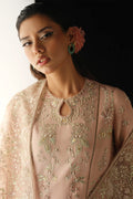 Zoe blends modern elegance with timeless allure. The luxurious silk shirt is adorned with intricate Tilla and Thread embroidery, shimmering sequins, and refined Cut Dana embellishments. Lustrous pearls and subtle Batki Ana add richness and texture. The plain silk trousers are paired with an elegant organza dupatta, making Zoe a perfect choice for those who appreciate exquisite craftsmanship, sophistication, and refined design.