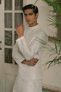 A short cotton kurta, loose trousers, and waistcoat set in seashell white, featuring Mughal-inspired tone-on-tone embroidery. The collar and sleeves have fine border embroidery, while the waistcoat carries repeat motifs in tonal anchor and Resham thread for a refined finish. Perfect for leading Eid prayers or welcoming guests at home, embodying the spirit of the day in timeless white.