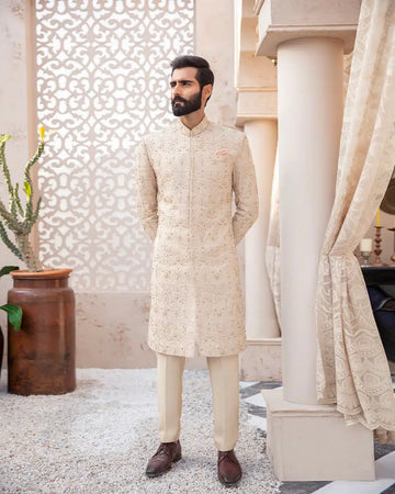 Description: Hakkan a subtle beige gold slim fit sherwani rendered using tonal embroideries and delicate embellishments. Paired with straight cut pants, the trimmed waistline aims to create an overall slimmer appearance.