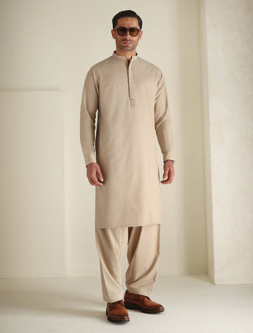 Pakistani Menswear | Ismail Farid - BEIGE LOGO-EMBROIDERED KAMEEZ SHALWAR