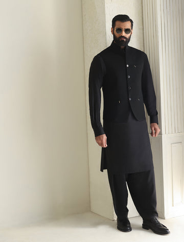 Pakistani Menswear | Ismail Farid - BLACK SLIM FIT WAISTCOAT