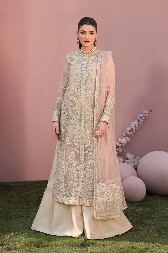 Introducing the graceful beige ensemble, carefully crafted from sheer organza fabric. This resplendent straight-cut shirt is engraved with mesmerising adda work that will captivate all eyes. Each intricate detail creates a captivating masterpiece that perfectly blends tradition with contemporary allure. It is paired with sharara pants and a light pink net dupatta adorned with embroidered borders and sequin spray all, providing a beautiful finishing touch.