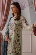 Embroidered Chiffon front with sequins Embroidered Chiffon back Embroidered Chiffon sleeves Embroidered organza sleeves lace Embroidered organza ghera lace Embroidered net dupatta – 2.50 Meter Raw silk trouser – 2.5 Meter Embroidered organza trouser lace.