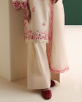A short-length structured shirt crafted in self-jacquard, adorned with exquisite Parsigara embroidery in coral red on a pristine white base. The embroidered sleeves add a touch of refined detailing, enhancing the graceful appeal of the ensemble. Paired with a traditional farshi shalwar for an elegant silhouette and complemented by a slub monar dupatta featuring a 4-sided Parsigara embroidered border on a color-blocked light coral base, Camélia beautifully blends timeless tradition with contemporary finesse.