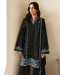 A contemporary black ensemble defined by its refined simplicity and artistic embroidery. The short paneled shirt features delicate dori-style embroidery in soft hints of aqua and blue, complemented by embroidered sleeves and neckline for a touch of elegance. Paired with black cambric culottes and a chiffon dupatta adorned with a 4-sided embroidered border, Noir exudes effortless sophistication and modern charm.