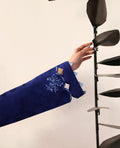 Long-length royal blue shirt with monotone embroidery inspired by Tatami stitch, covering the shirt all over. Embroidered sleeve borders and neckline add a touch of elegance. Paired with a printed Twill Marina shawl.