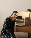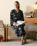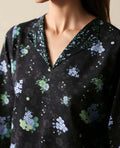 A black shirt adorned with vibrant lime and green florals, paired with matching floral trousers. The long shirt and beautifully detailed print create a striking, fresh look that's both bold and elegant.