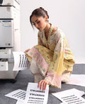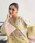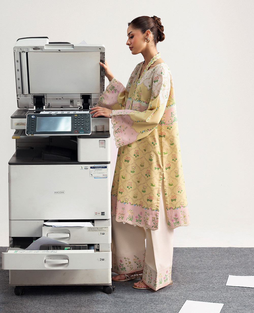 This refined design presents a harmonious fusion of vintage aesthetics and elegance, incorporating floral motifs on a pastel backdrop complemented by laced inspired borders with romantic and graceful vibe in a lemon yellow shirt with cream trouser printed hem detail.
