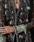 Black takes on a daringly elegant edge in this front open organza pishwas where tradition flows seamlessly into contemporary artistry. Intricate shikargah motifs entwine with delicate florals across cascading panels creating a canvas that feels both timeless and distinctive. Serene blue arches and vibrant pink and green borders breathe depth and modern charm into the silhouette while fine pink threadwork, subtle sequins, and meticulous embroidery add layers of texture and allure. Embroidered sleeve borders complete the refined detailing, while the black organza dupatta scattered with floral sequins casts a soft, enchanting shimmer. A statement of sophistication designed to be remembered.