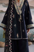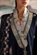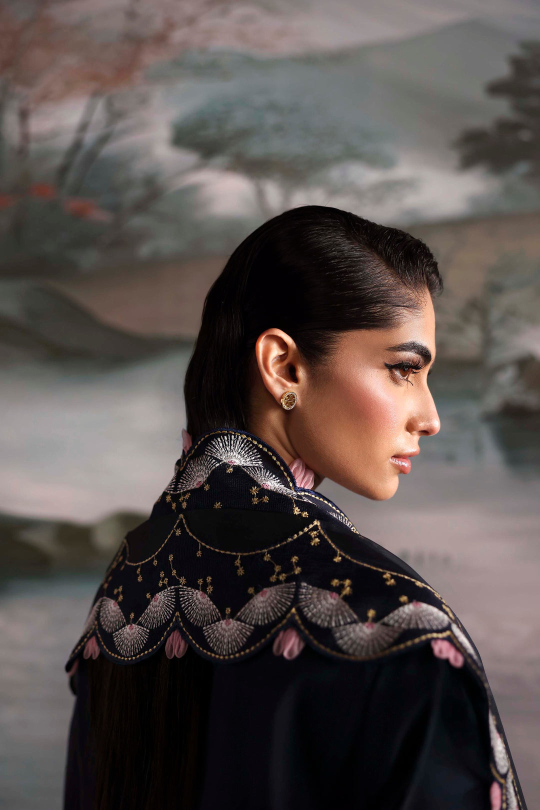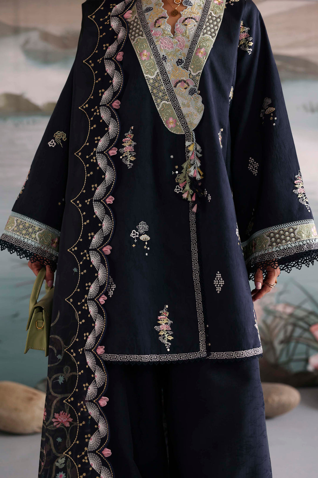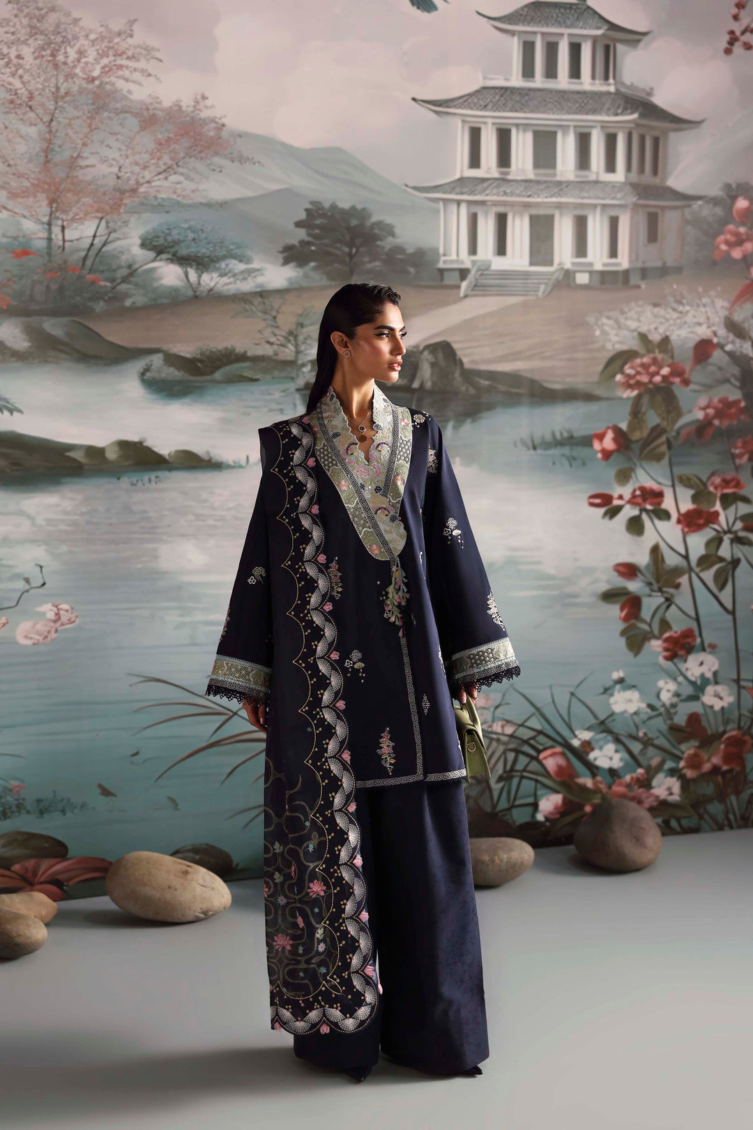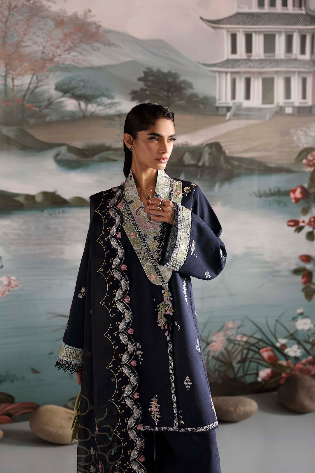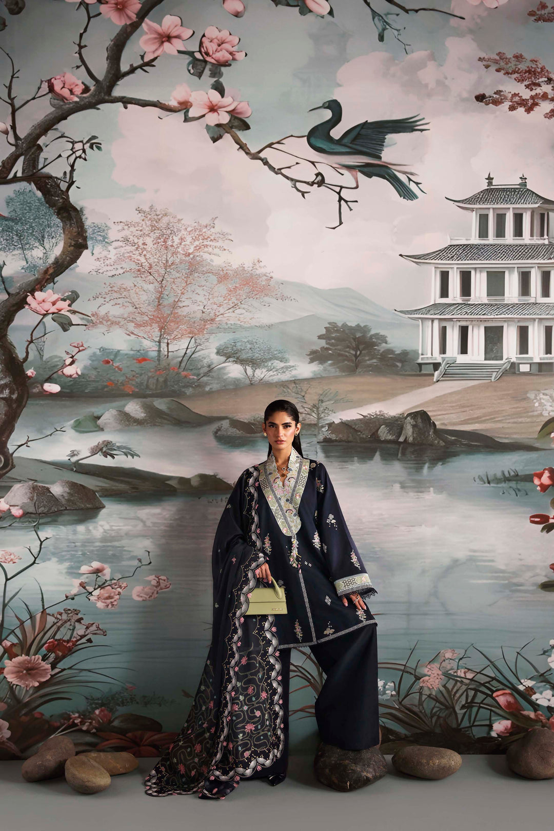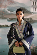 A stunning navy heavy silk ensemble adorned with intricate Japanese embroidery. Perfect for brunches, dinners, and high teas, offering both elegance and comfort. A beautifully crafted luxury 3-piece outfit.