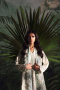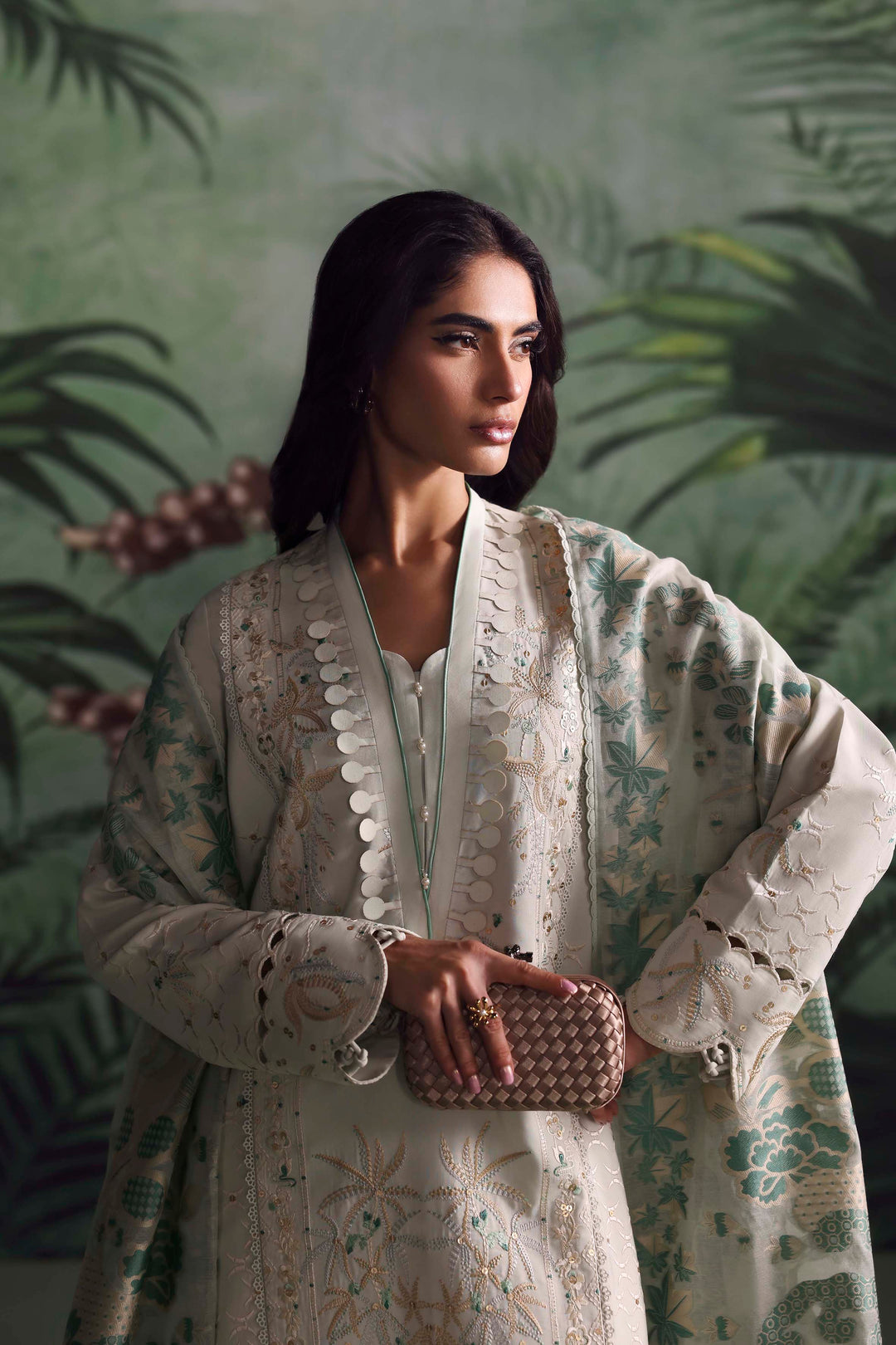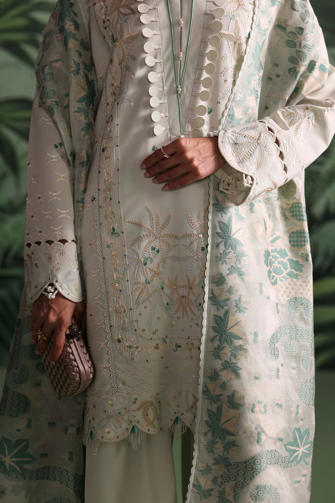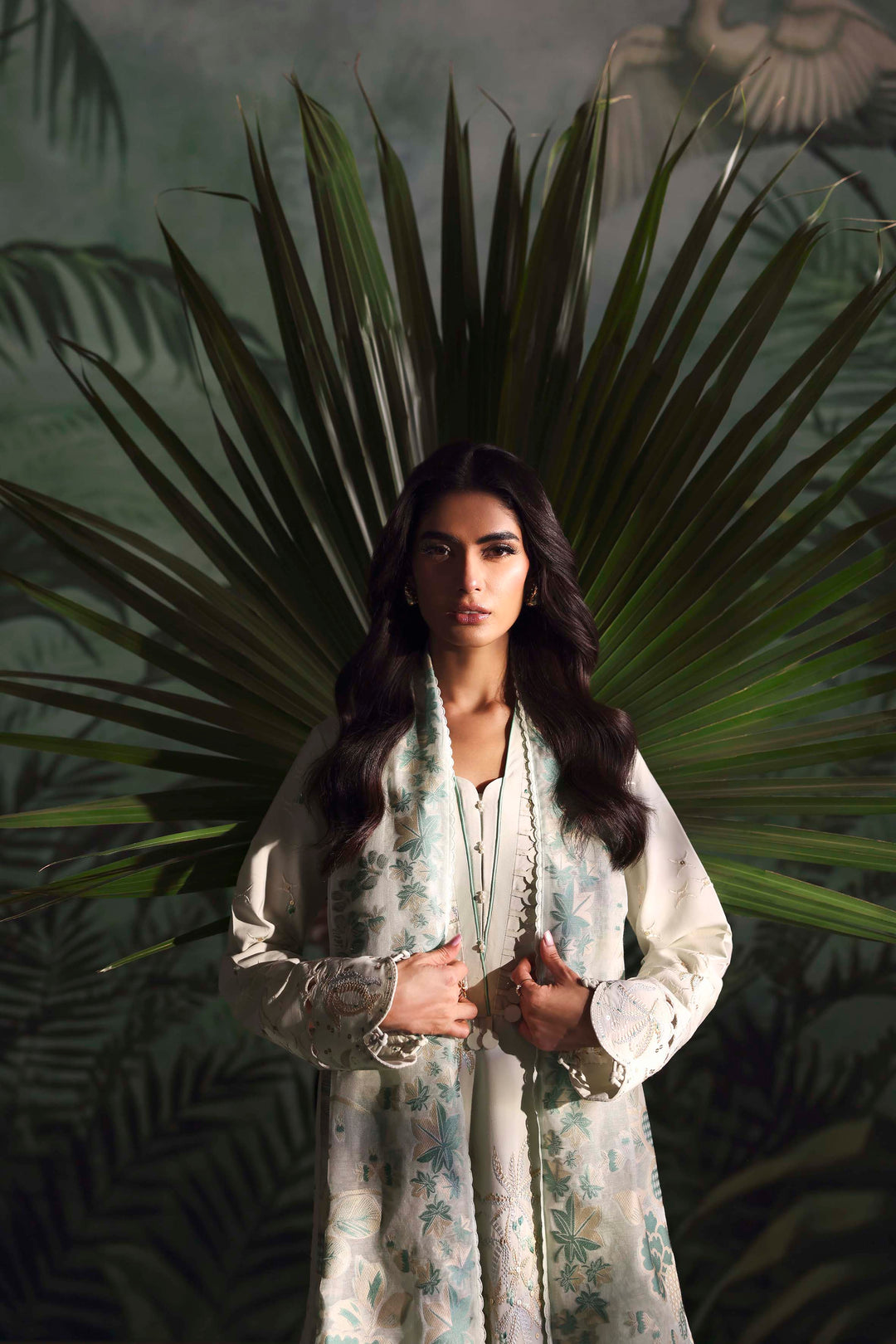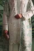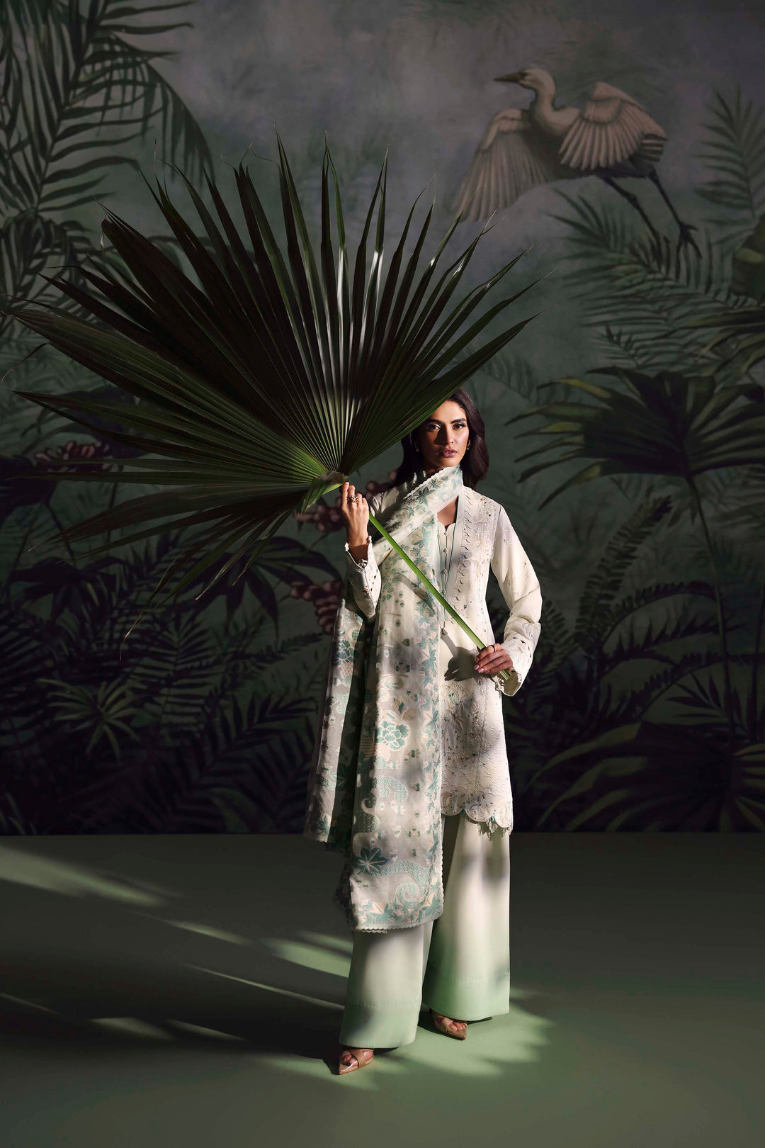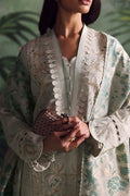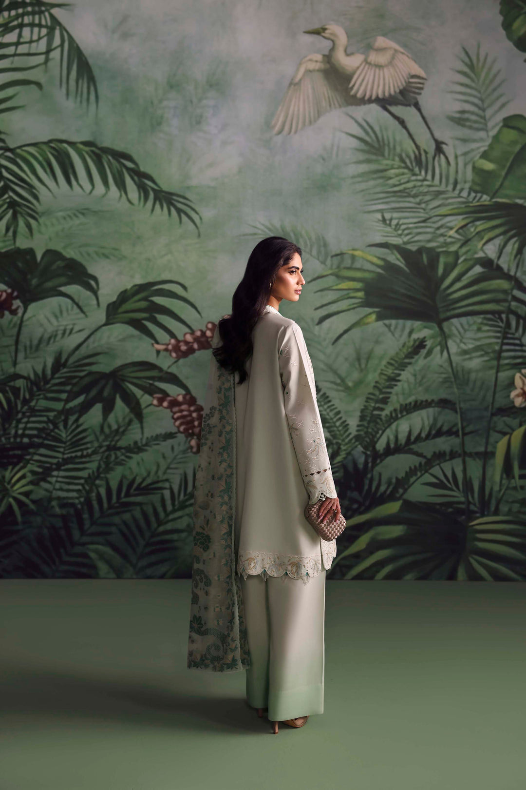 A serene ensemble in the lightest hue of mint, featuring exquisite traditional Sashiko Japanese embroidery. Paired with a beautifully crafted jacquard dupatta in silk-organza, adorned with a delicate Japanese tapestry pattern. The ombré mint green shalwar completes this graceful look.