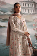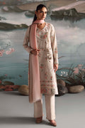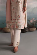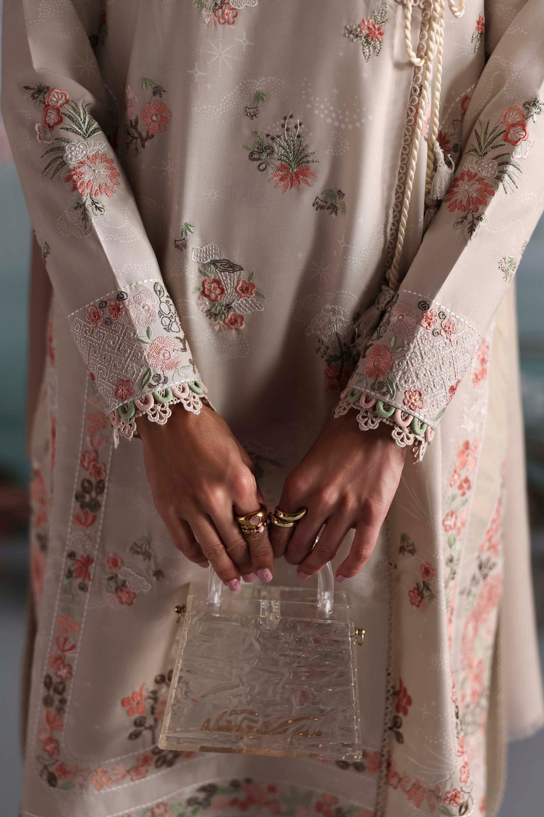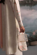 An elegant almond-colored thick silk outfit adorned with delicate blossom prints in beige, cream, and soft peach tones. Paired with an imported silk-wool scarf in soothing shades of peach and beige for a refined, timeless look.