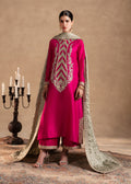 A Lengthening silk shirt adorned with hand worked florals and chatta patti detailed prominent neckline comes paired with delicately worked culotte pants and a charmeuse silk contrasting shawl in mint green.