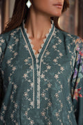 Elevate your festive winter wardrobe with this exquisite teal ensemble. This outfit features delicate white lace embroidery along the neckline, hem, and sleeves, beautifully enhanced with multicolored floral appliqué detailing. Paired with matching straight pants adorned with lace finishing, the look strikes a perfect balance of elegance and grace. The outfit is completed with a vibrant shawl in shades of pink and teal, showcasing bold floral prints for a refreshing contrast.