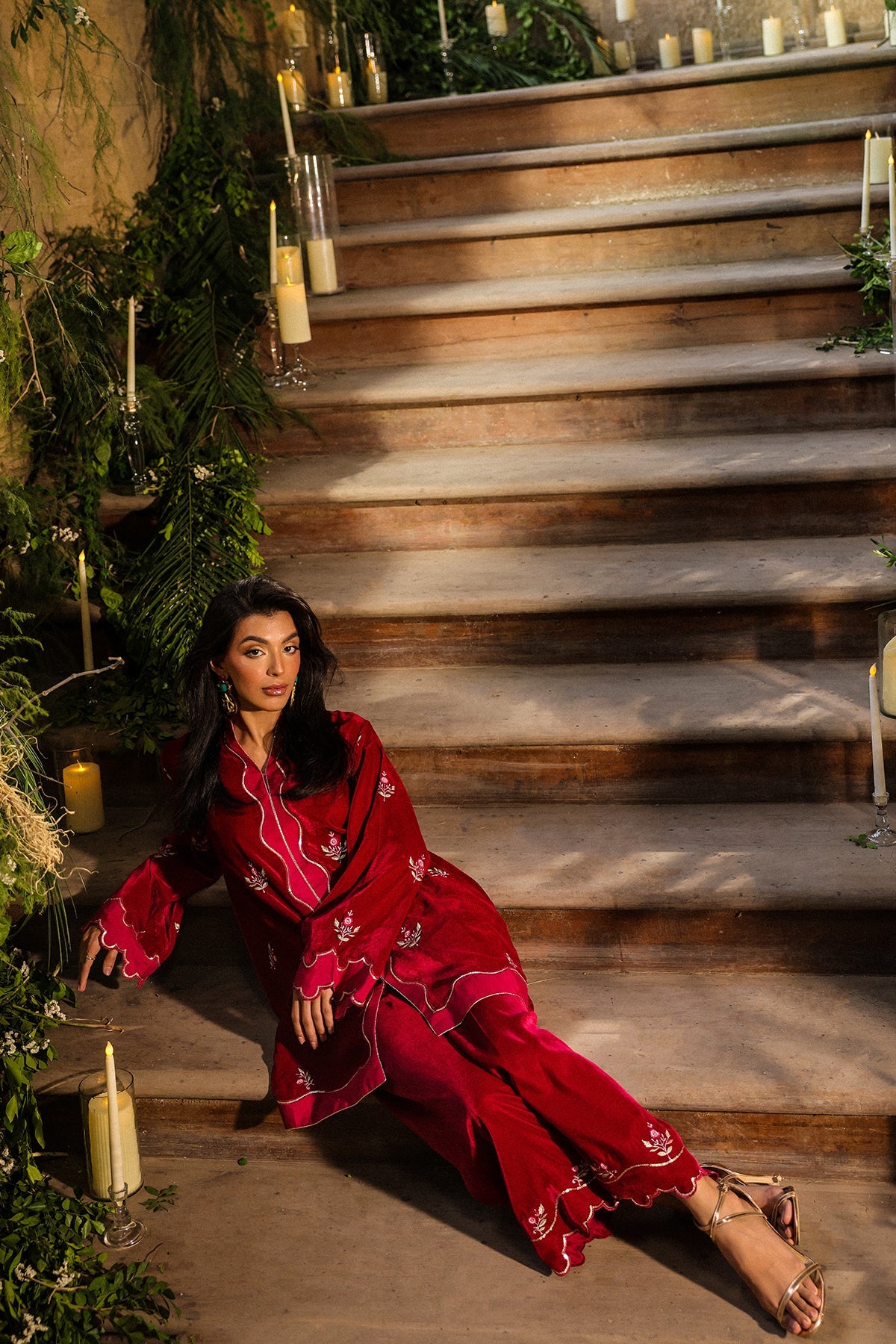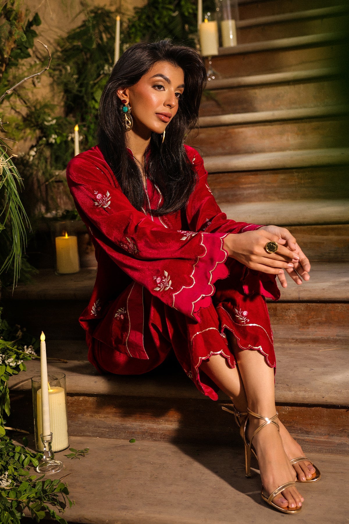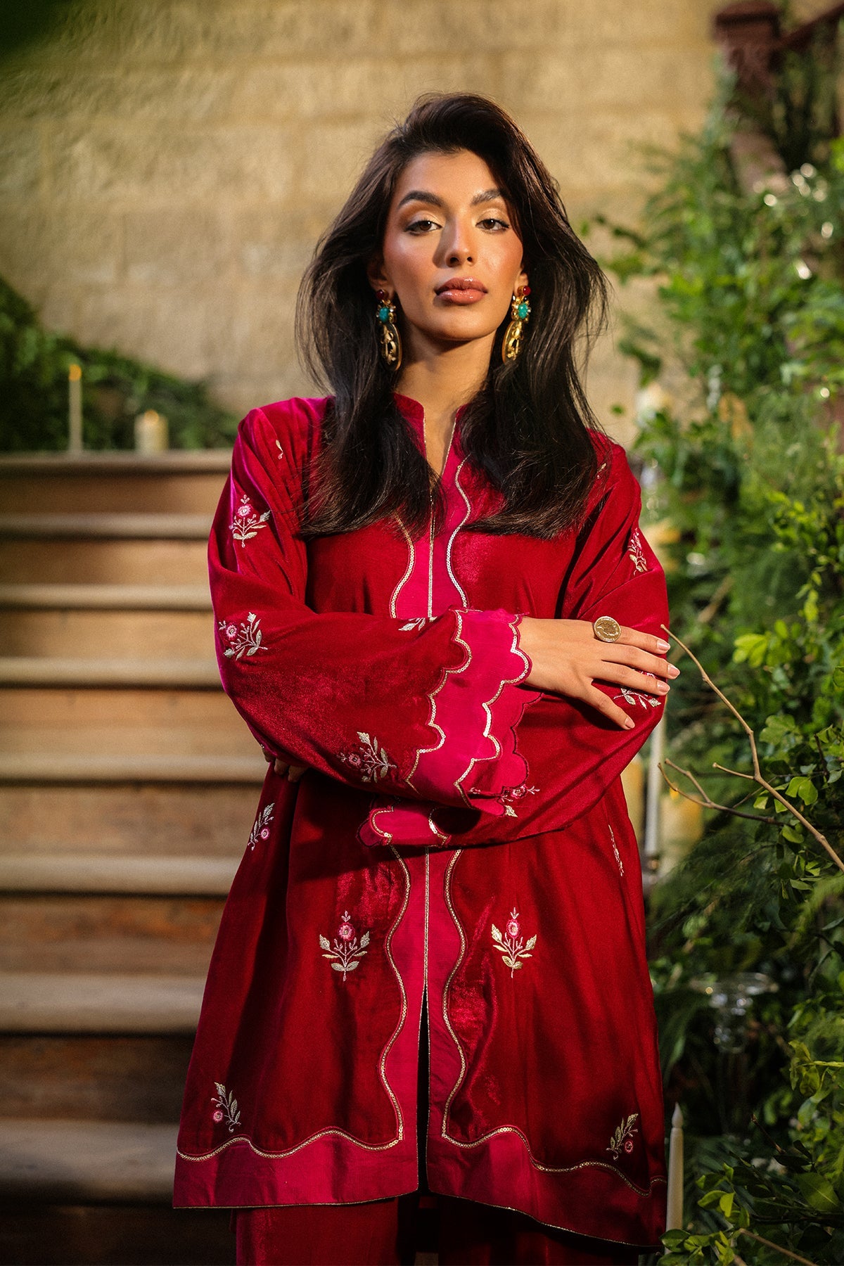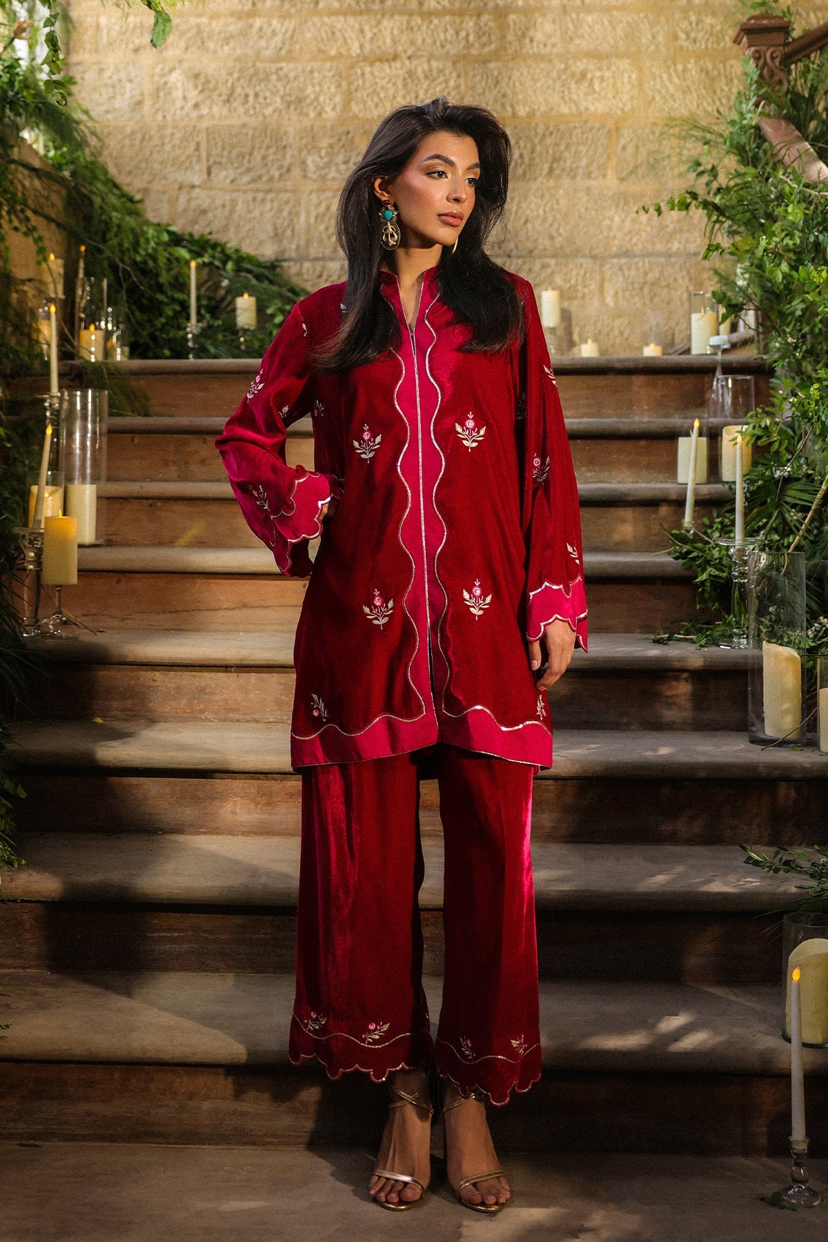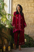 This striking crimson velvet Co-ord set captures the essence of luxury and charm. Intricately embroidered with gold threadwork and paired with matching straight trousers. it’s an ideal statement outfit for celebratory occasions.