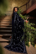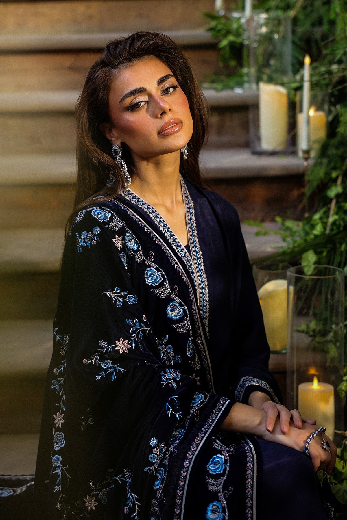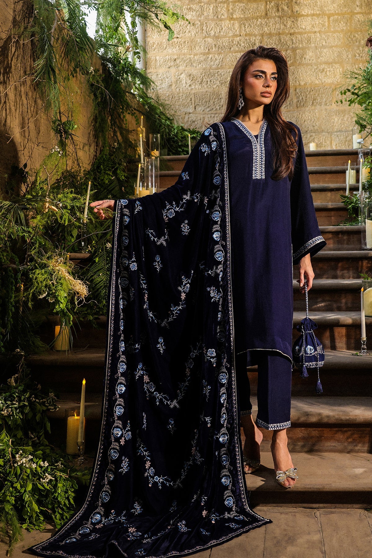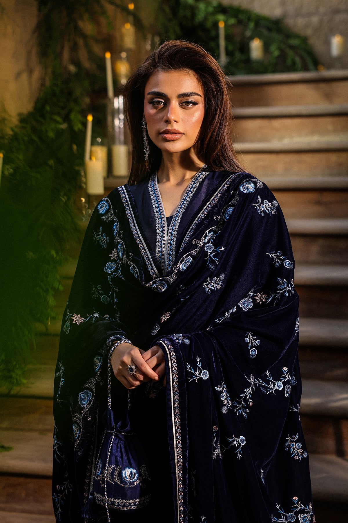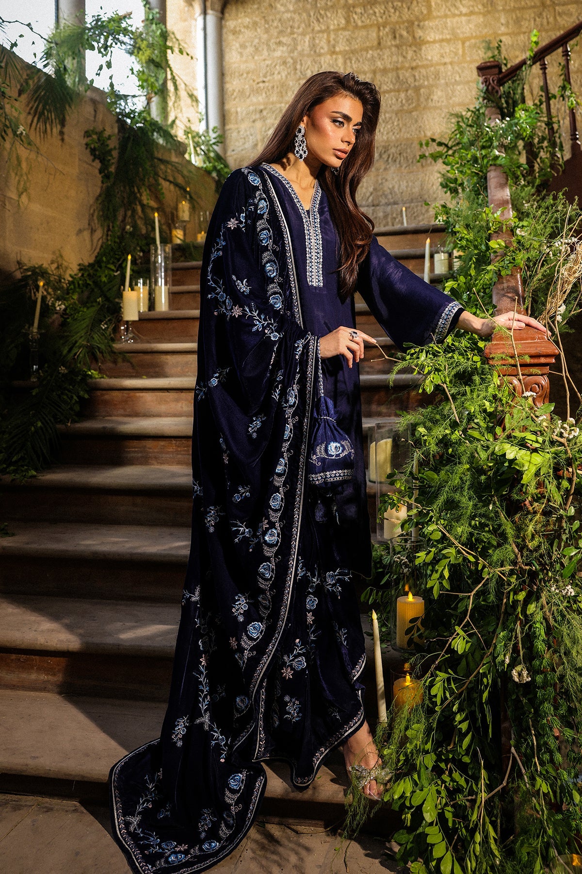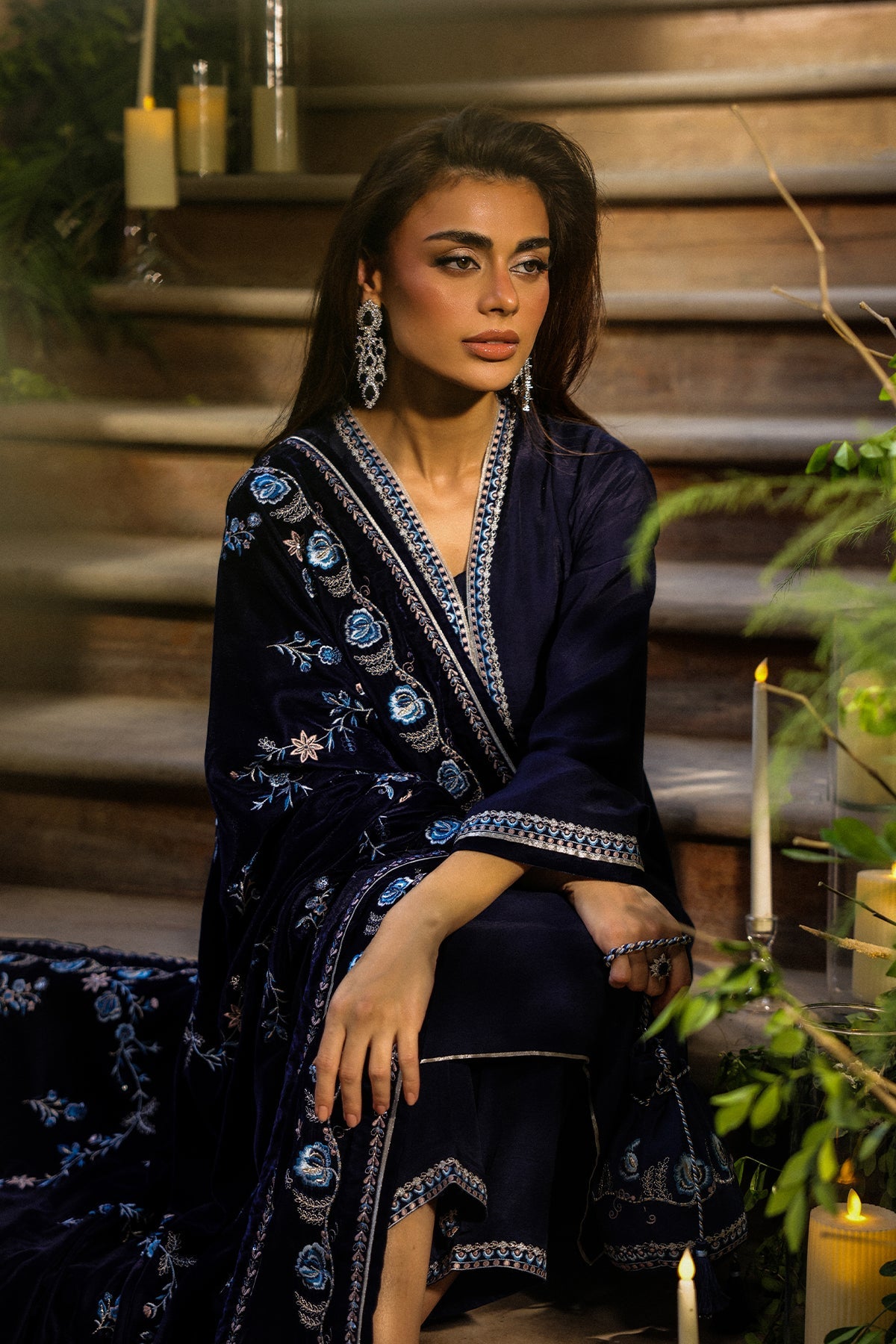 Enchanting and regal, this midnight blue velvet 3-piece suit stands out with exquisite silver threadwork and a flowing velvet shawl. The intricate detailing captures the essence of luxury, making it ideal for festive evenings or formal events.
