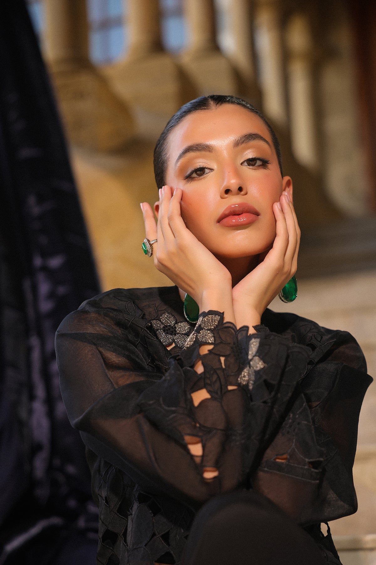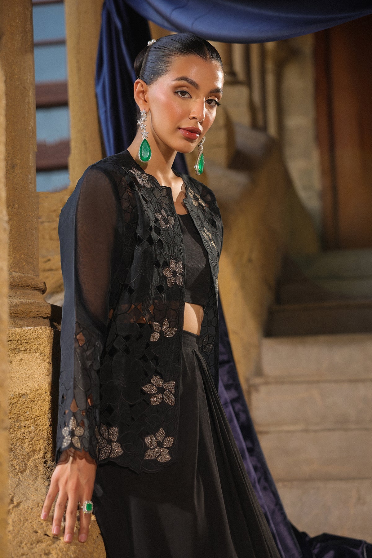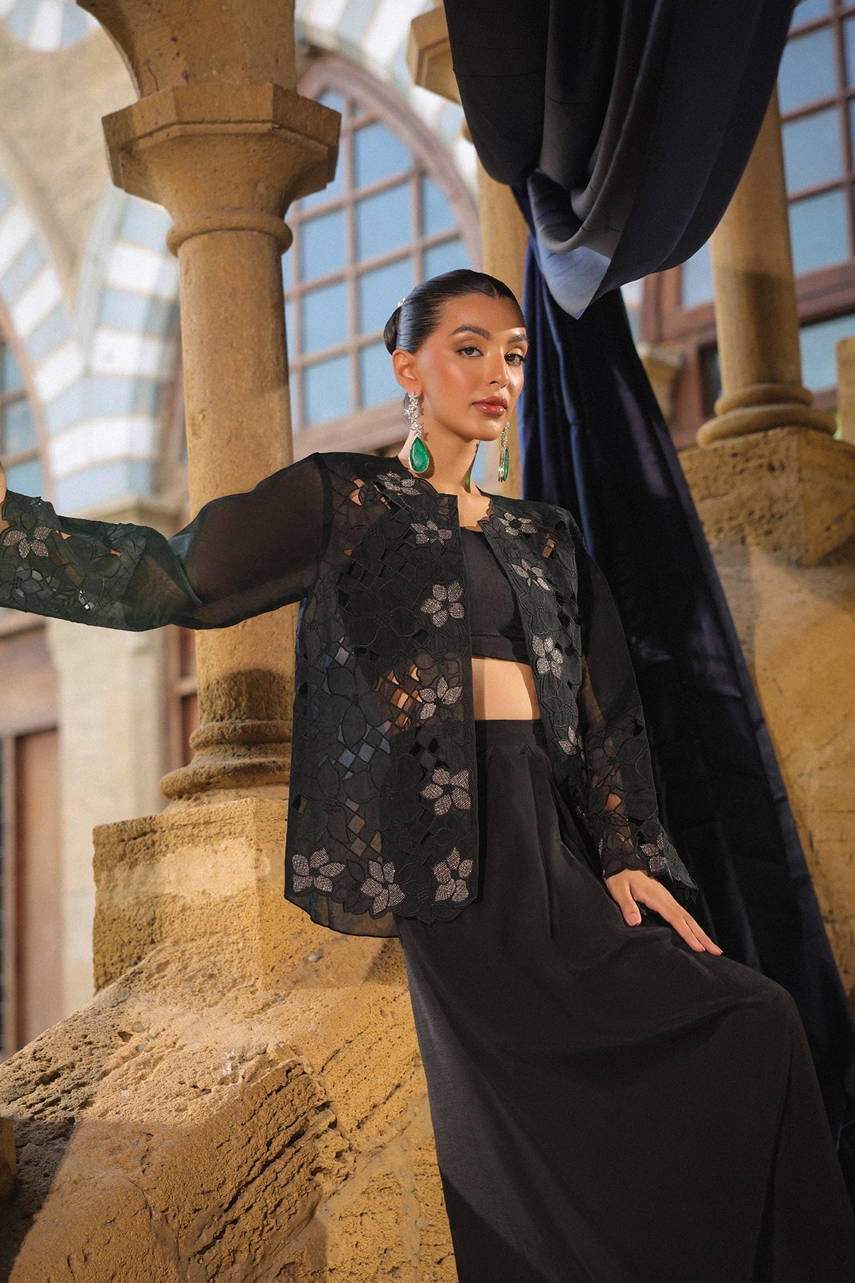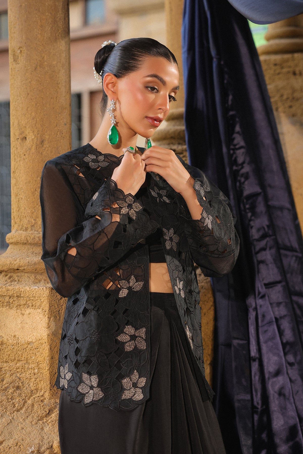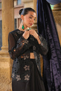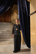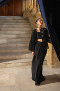 Classic black 3 pieces outfit with intricate floral embroidery jacket, inner top and paired with long skirt. The sleek design and relaxed fit create a refined yet effortless look suited for chic semi-formal affairs.
