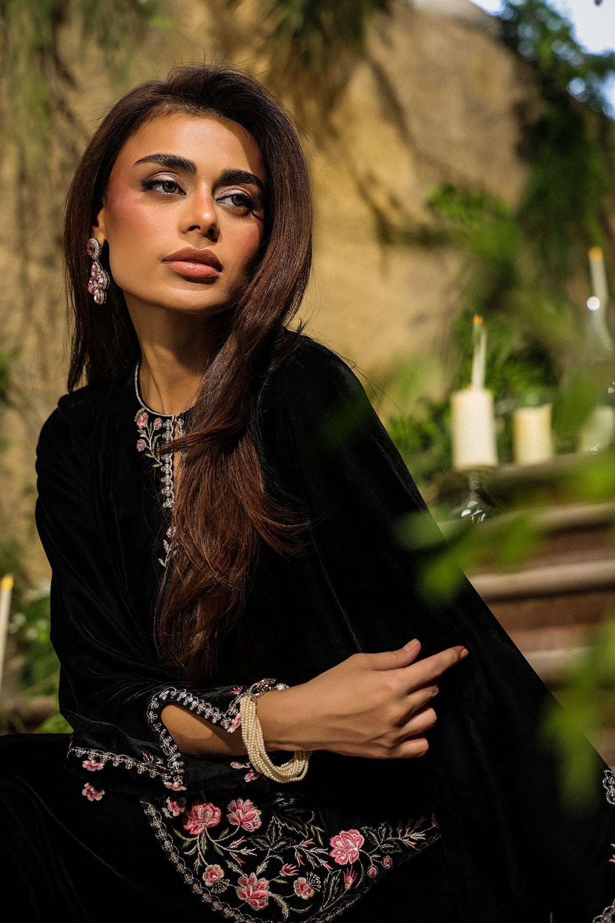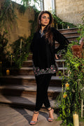 An effortlessly chic onyx black velvet Co-ord set that blends modern minimalism with timeless class. The sleek straight-cut shirt, accented with delicate embroidery at the hem and sleeves, pairs perfectly with fitted shalwar for a contemporary formal look.