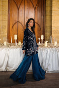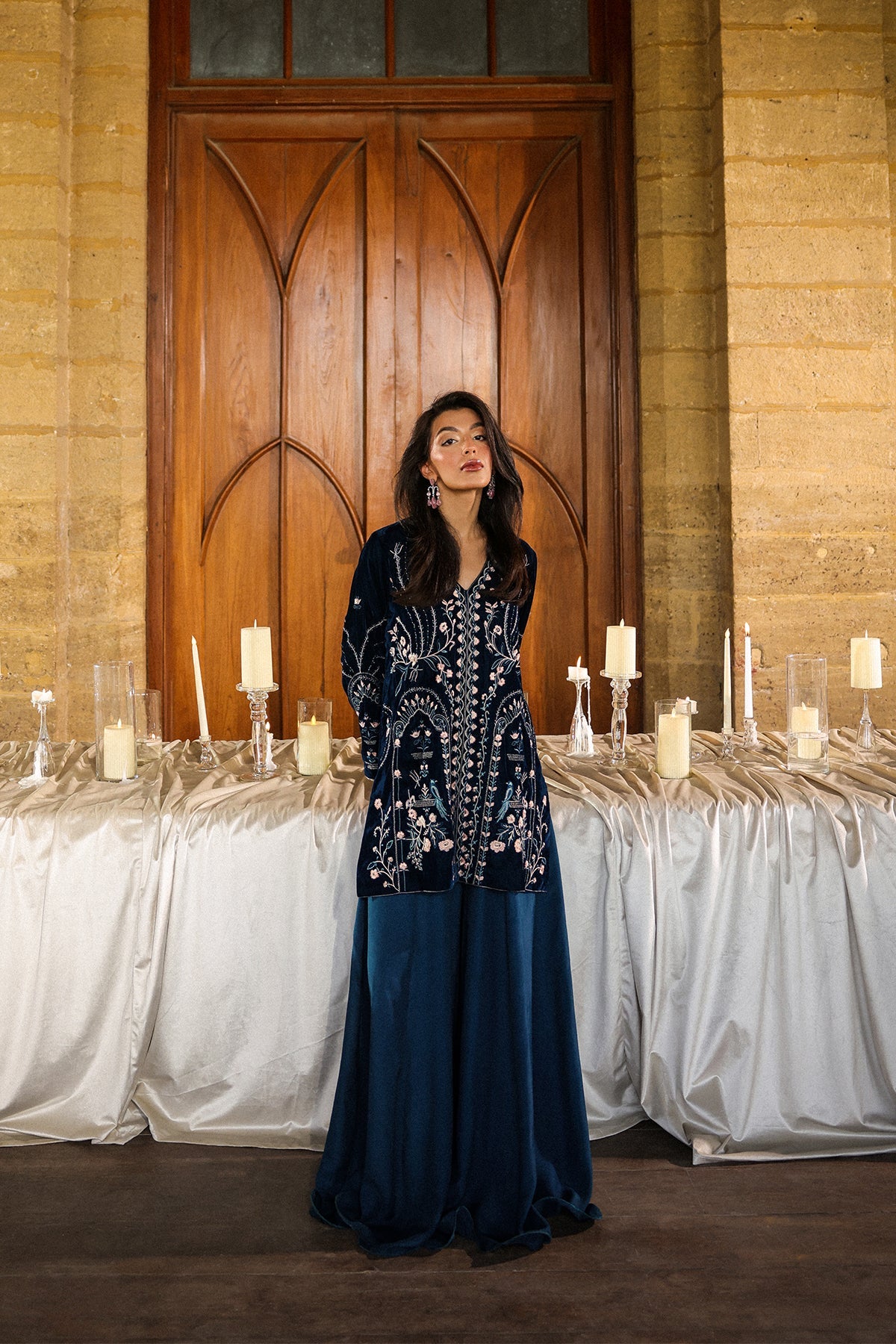 A modern twist on traditional elegance, this sapphire blue velvet 2-piece jacket and dhaka pants set features a heavily embellished front with a graceful floor-length silhouette. The structured top and soft flow of the velvet create a glamorous statement look.