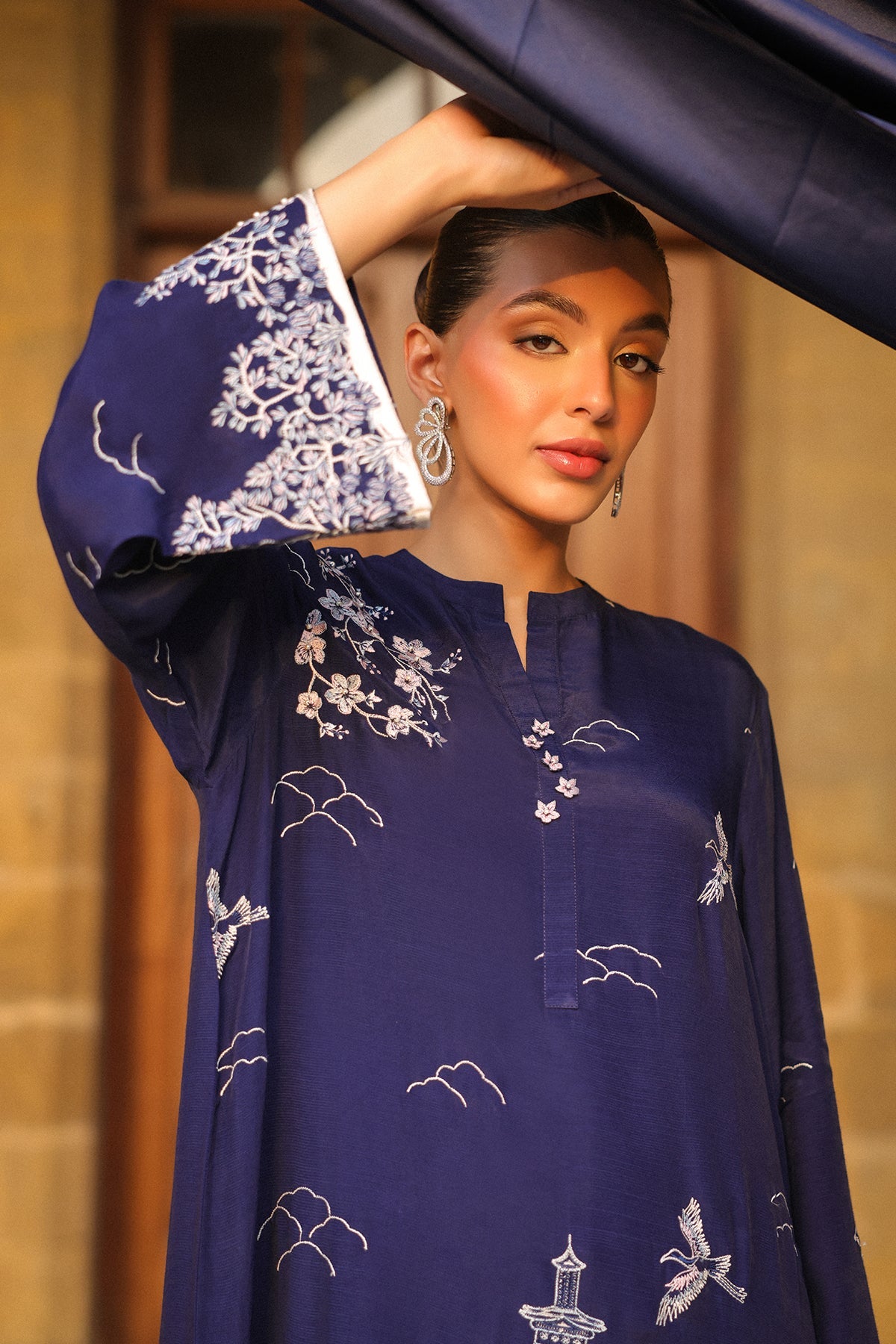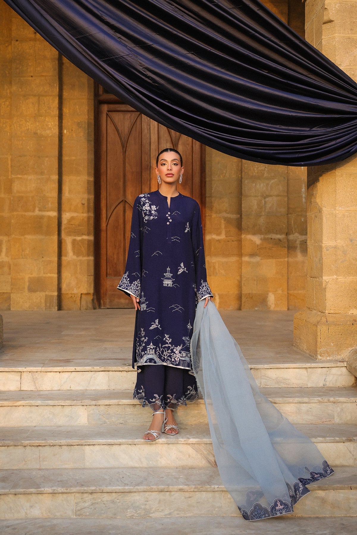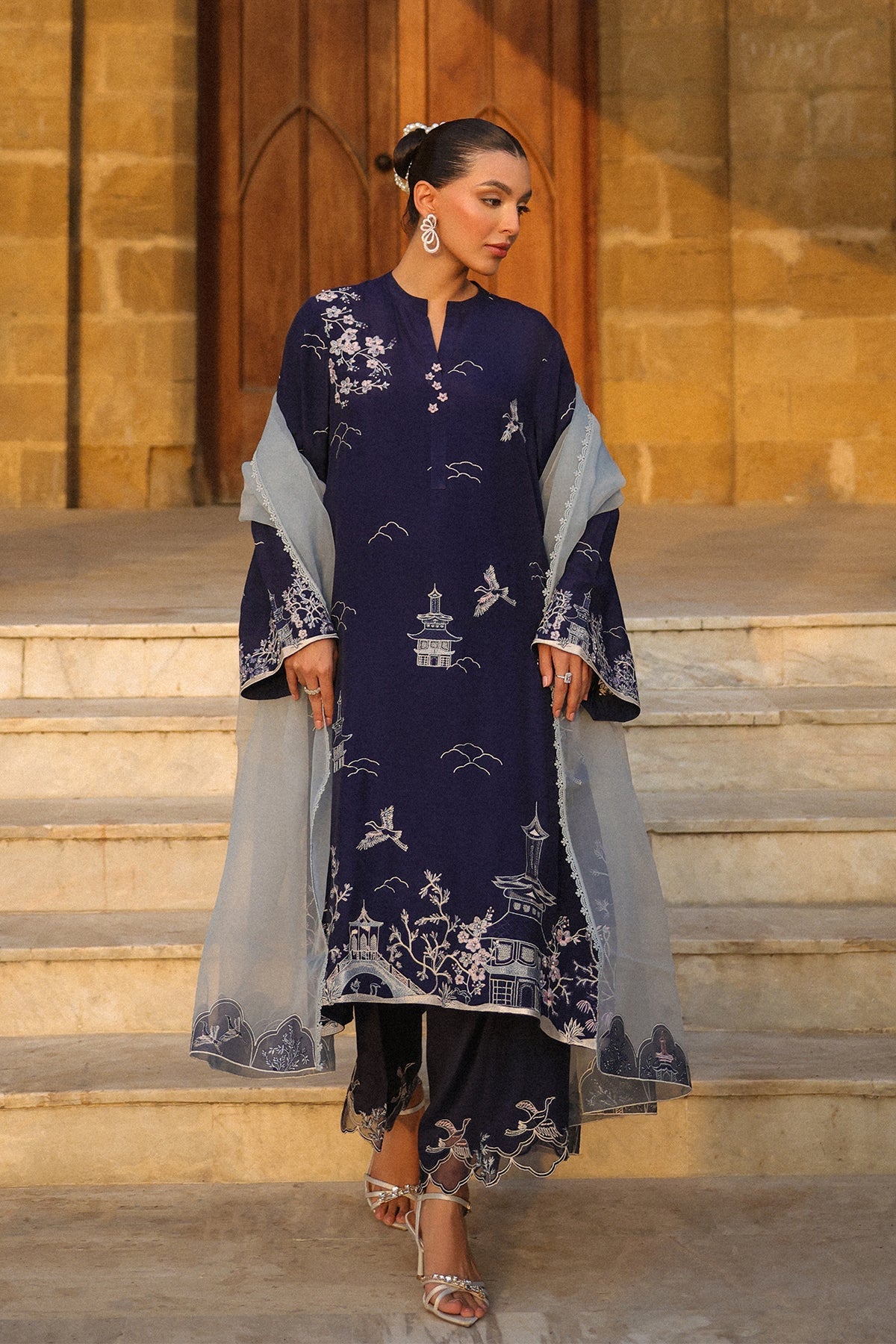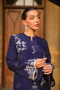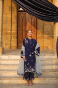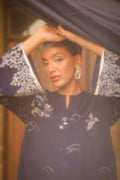 This sophisticated navy blue contemporary 3-piece ensemble showcases a modern elongated silhouette shirt with stylish side slits. Embroidery adorns the shirt, complemented by minimalist floral & oriental motif and applique borders embroidered border slim-fit pants and paired with an airy, semi-sheer organza dupatta completes the look.