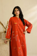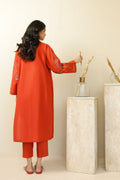 A striking rust co-ord set featuring a long shirt adorned with fusion embroidery blending Aztec and geometric patterns. Paired with matching culottes for a bold, contemporary silhouette.