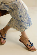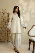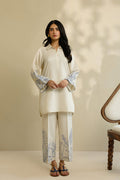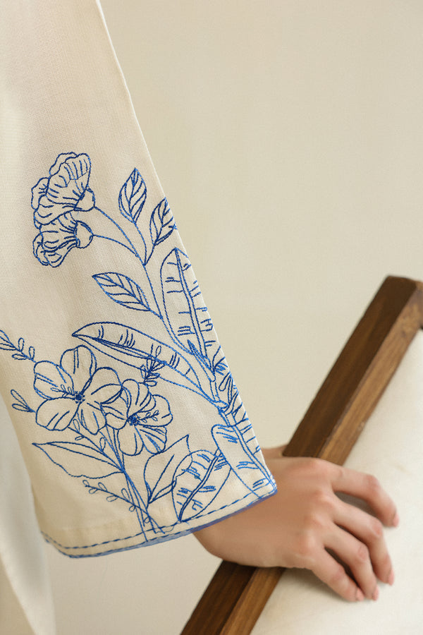 An ivory co-ord set adorned with intricate electric blue botanical embroidery. Featuring gracefully dancing botanic on the sleeves and culottes, and finished with a smart shirt collar for an effortlessly elegant look.