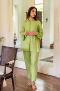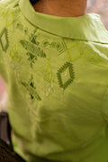 This lime green two-piece co-ord set, featuring a front-open shirt with delicate lace inserts. The design is elevated with monochromatic embroidery on the sleeves and back, paired with matching culotte pants.