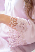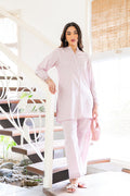 A soft blush pink two-piece set with a short kurta adorned with pearl bow tassels on the neckline and lace accents on the sleeves. Paired with matching culottes finished with delicate lace on the hem.