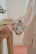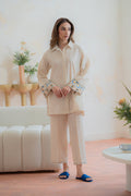 A beige co-ord set featuring vibrant Suzani embroidery on the back and sleeves, beautifully styled with a frayed placket for a touch of artisanal charm.