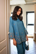 A serene blue co-ord set featuring delicate tonal embroidery inspired by traditional floral vines. The shirt showcases intricate thread work along the sleeves and hemline, adding a touch of sophistication. Tailored straight pants complement the ensemble with a refined, modern edge.