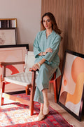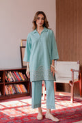 A refreshing sea-green co-ord set that embodies understated elegance. The relaxed-fit kurta showcases a soft collar neckline with front button detailing and delicate wavy embroidery along the hemline and pant cuffs.