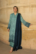 A sea green suit featuring a gradient-woven ikat design, blending traditional craft with contemporary style. Paired with a dark teal shawl, it creates a striking contrast for an effortlessly elegant look.