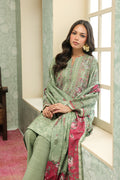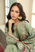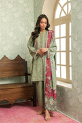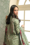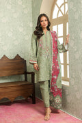 This elegant 3-piece ensemble features a straight-cut kurta in a soft sage green base, adorned with intricate floral and vine prints in shades of blush pink and muted ivory. The neckline is delicately detailed with embroidered motifs and fabric buttons, adding a refined touch. Paired with matching straight trousers and a contrasting sage and magenta printed dupatta with scalloped edges, this outfit strikes the perfect balance between soft pastels and bold accents – ideal for a graceful daytime look.