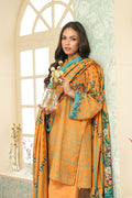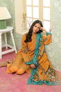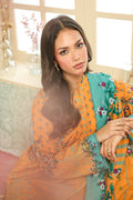 This striking 3-piece ensemble is crafted in a bold saffron-orange base, elevated with intricate geometric patterns across the shirt. The design is contrasted with a refreshing teal panel adorned with cascading floral vines in multi-hued accents, adding vibrance and charm. Paired with a solid orange trouser for balance, the look is completed with a printed dupatta featuring botanical motifs on a teal canvas, tying the outfit together with a lively and contemporary flair.