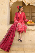 Elevate your wardrobe with timeless elegance in this Crimson Bloom khaddar Embroidered outfit. This ensemble features intricate floral embroidery in rich warm tones, lending a delicate contrast and feminine charm. Completing the look in a beautifully embroidered shawl, embellished with traditional yet contemporary geometric motifs and bordered edges that add depth and heritage-inspired appeal.