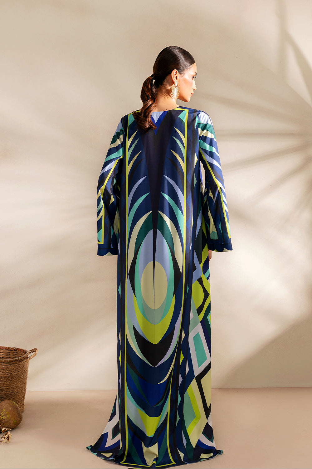 A cascade of movement and light, Nocturne Vagues is silk shaped into poetry. The kaftan silhouette flows with effortless grace, its deep navy canvas alive with sweeping wave-like patterns in jade, lime, ivory, and aqua. A lace-up neckline lends a modern touch, while the wide sleeves and fluid drape embody unrestrained elegance. Bold yet serene, striking yet timeless — this is silk designed for evenings by the sea, summer gatherings, and luminous escapes.